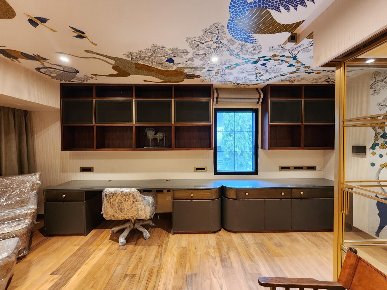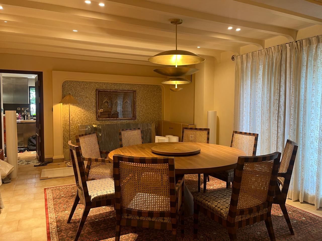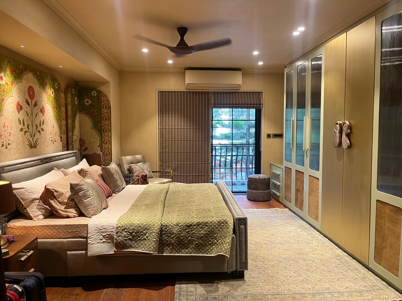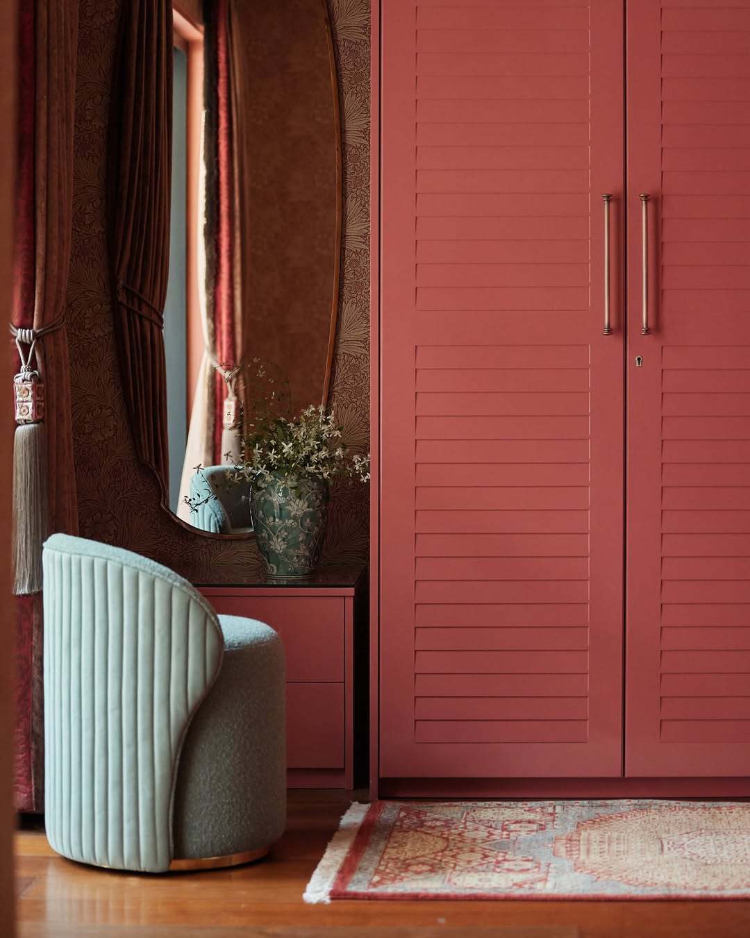 In the Tana House, the walk-in closet and dressing room are an elegant extension of the home’s most beautiful bedroom. A soft sea-foam chair pairs with a chinoiserie vase filled with foraged ivy. Blushing terracotta walls, the subtle reflection of William Morris wallpaper, and layers of custom textiles create a warm, feminine, and exquisitely detailed setting