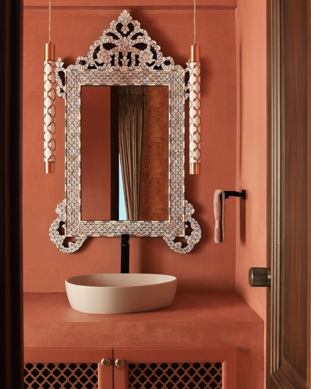 Simple inspirations, elevated. The warm terracotta of this space draws from the heart of India—reimagined here as distressed lime wash walls. Paired with a bespoke mother-of-pearl inlay mirror, this bathroom becomes a quiet study in restrained Indian elegance. Part of a series of thoughtfully crafted spaces from the Tana House.