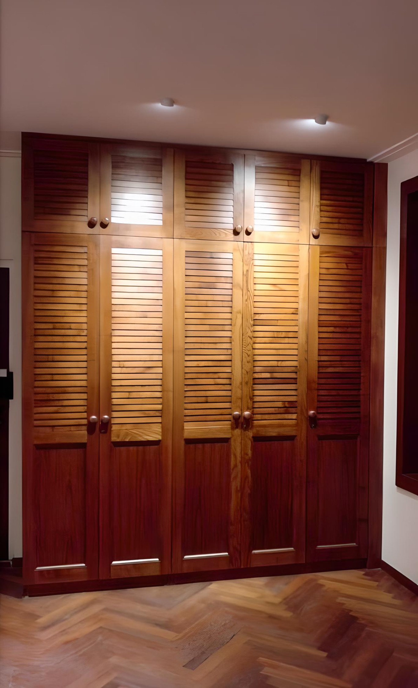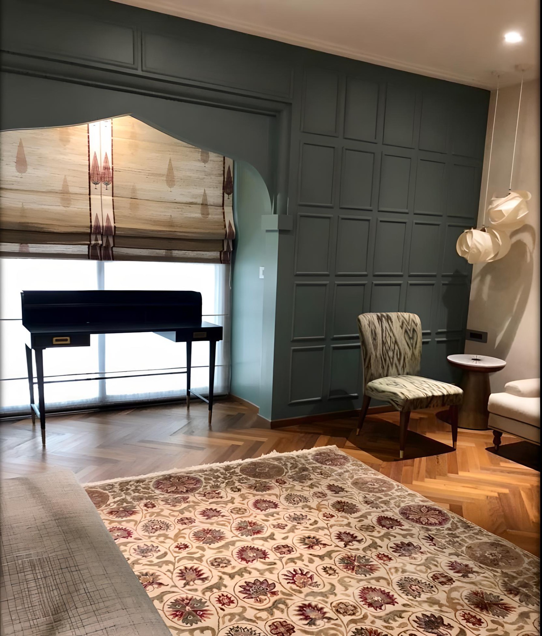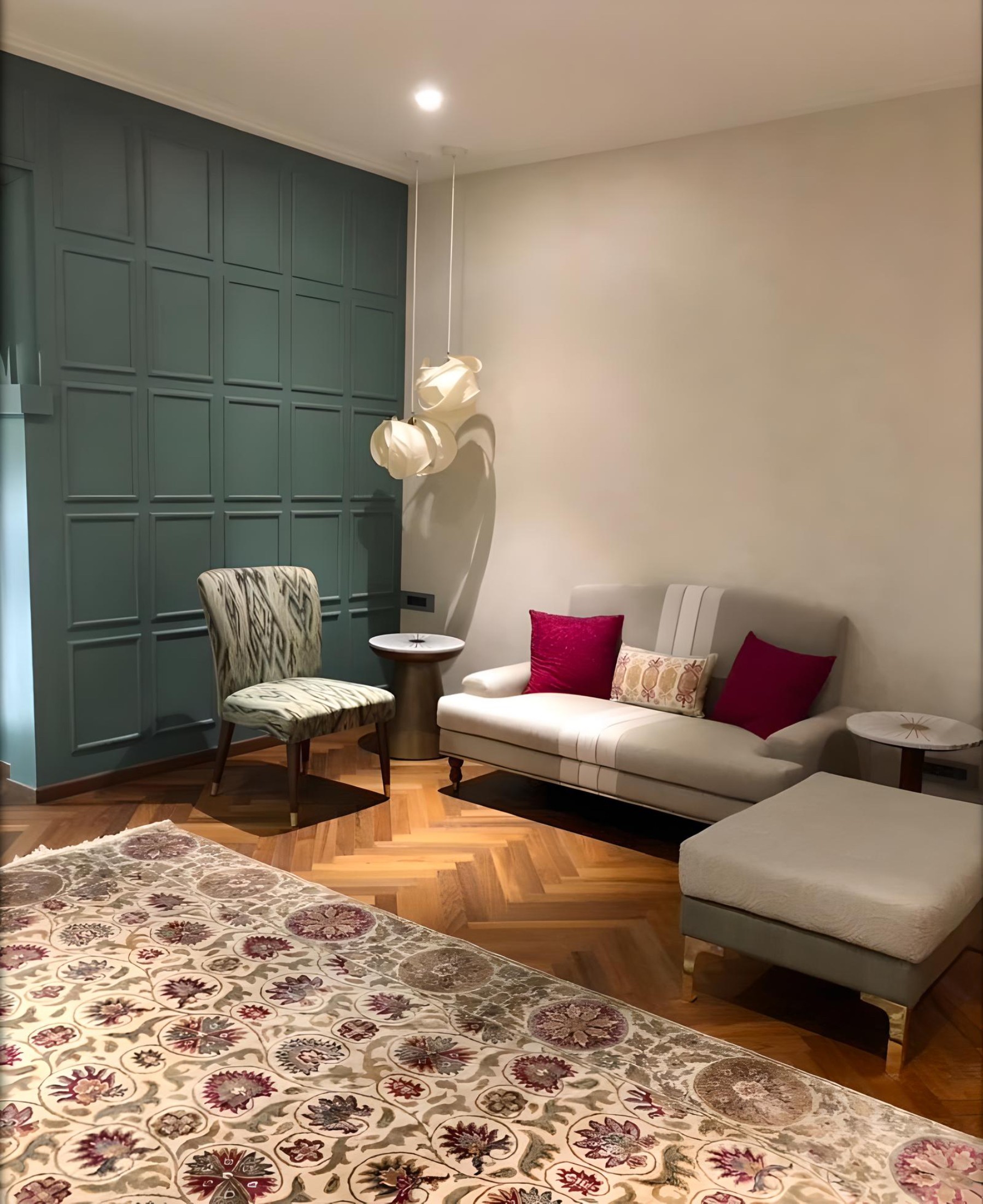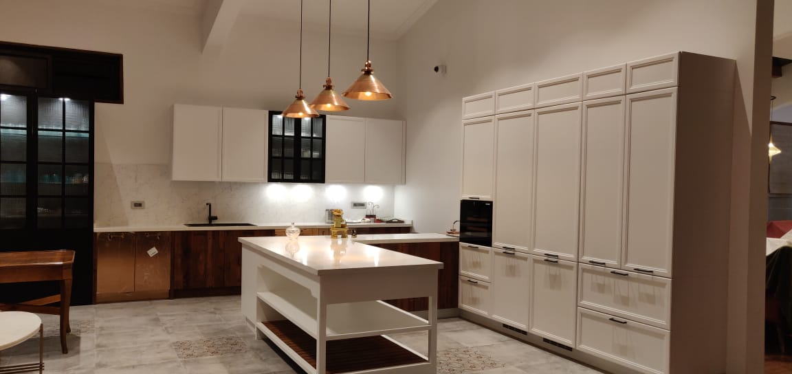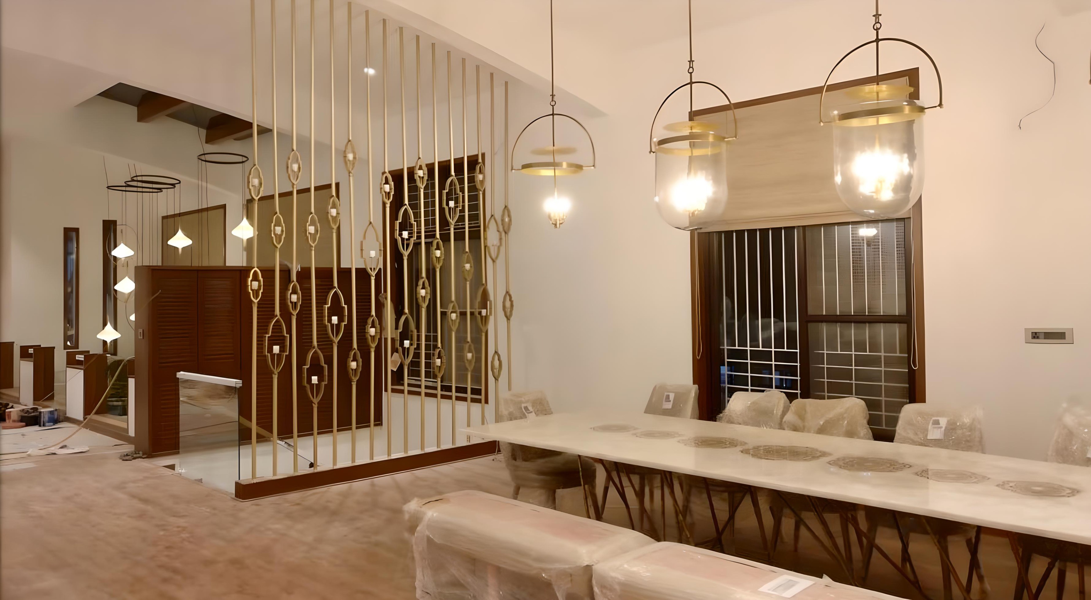 Defined by a vertical brass-finished partition screen with geometric detailing, this dining area features a white marble table anchored by a sculptural metal base and illuminated by oversized glass pendant fixtures.