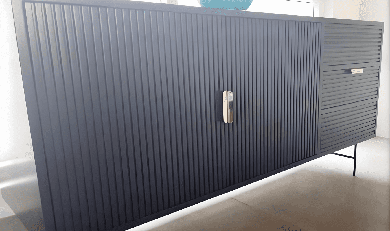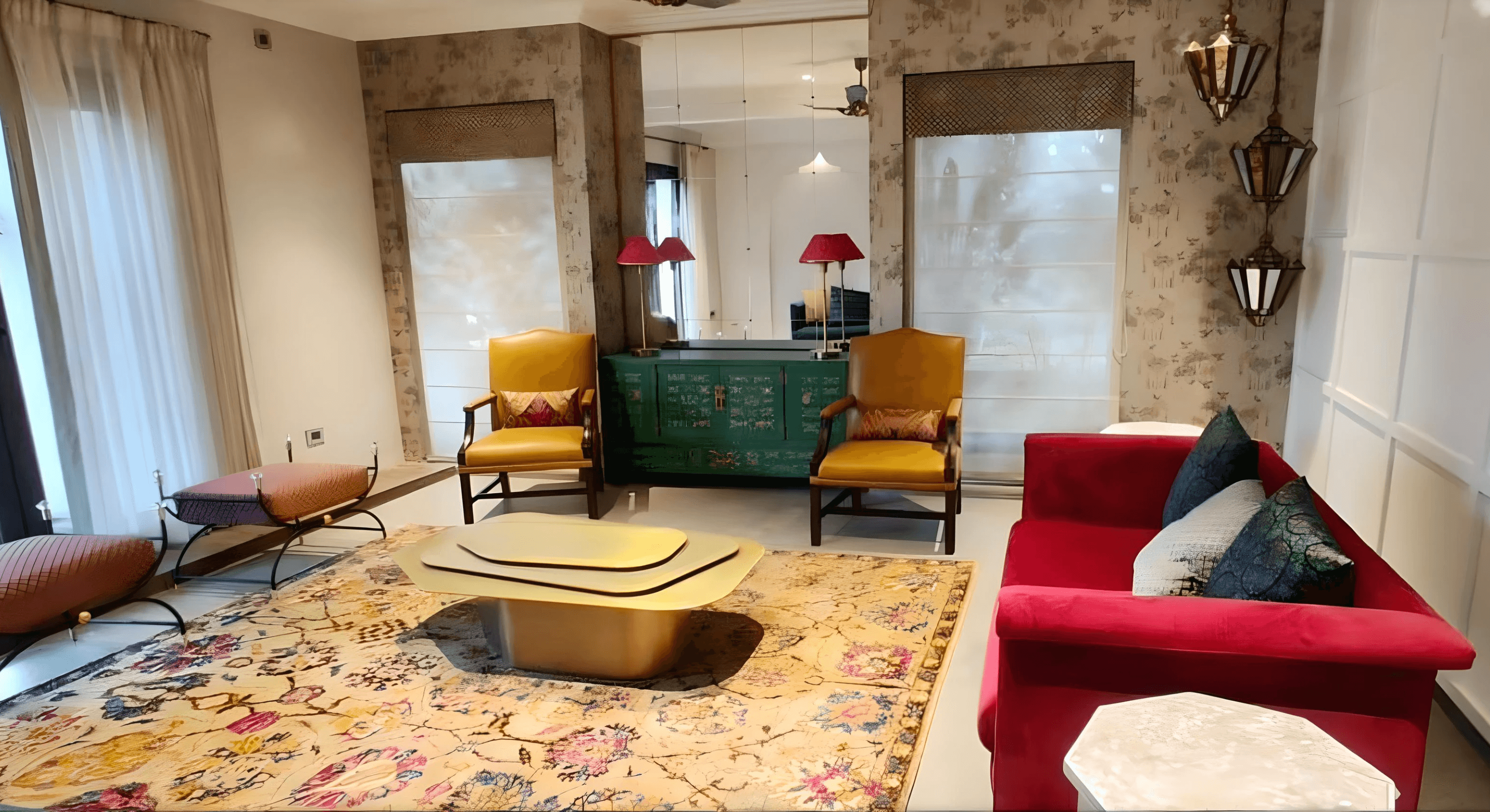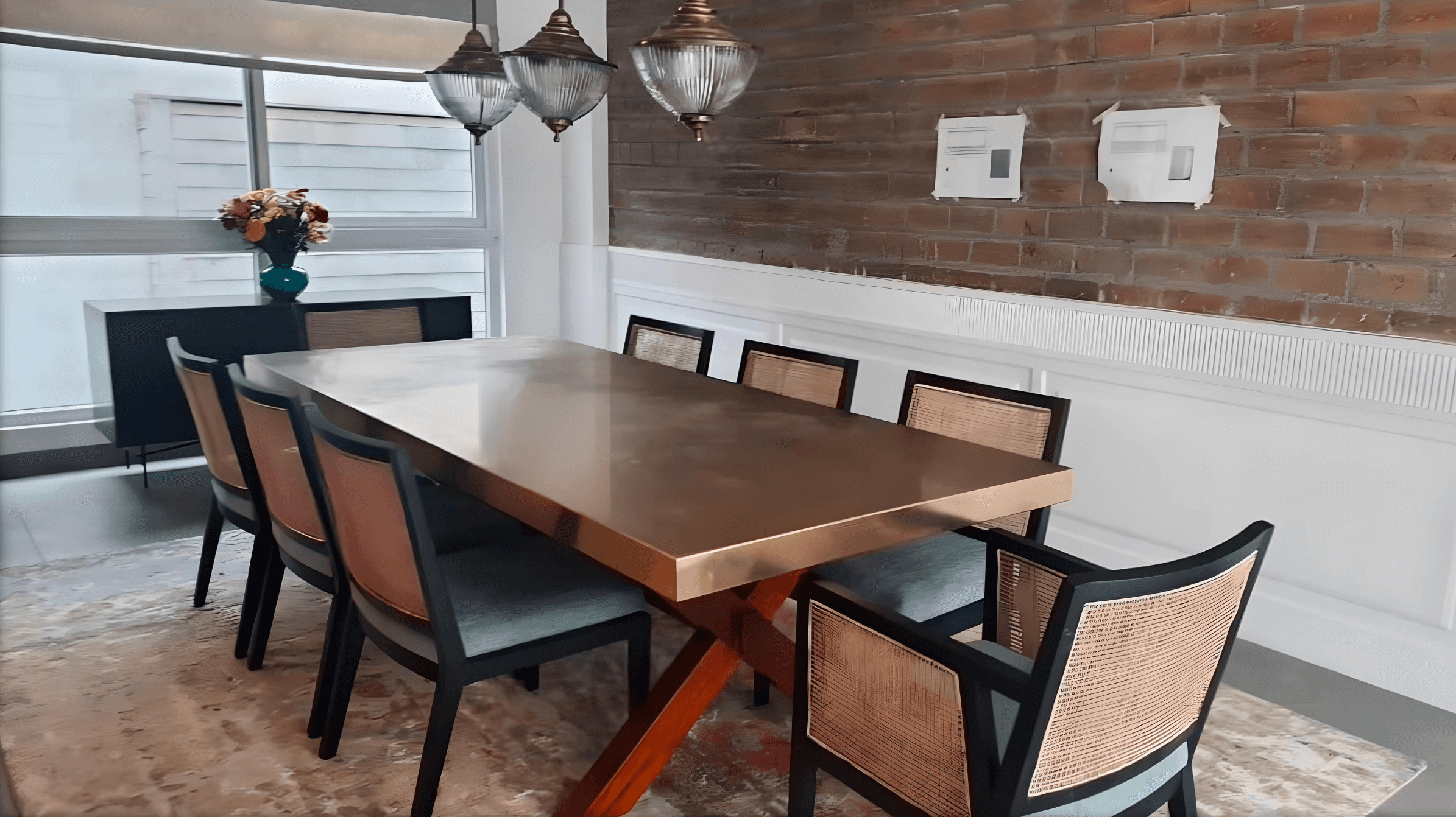 This dining space articulates a sophisticated industrial-rustic aesthetic, anchored by a statement table featuring a burnished copper-toned surface and a timber trestle base. The seating juxtaposes black structural frames with natural cane webbing and teal upholstery, offering a tactile contrast against the exposed brick wall and classic white wainscoting. Suspended ribbed-glass pendant fixtures provide vintage-inspired illumination, while a distressed area rug grounds the space in warmth and texture.
